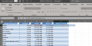 de lijst van gegevens is nu mooi opgeslagen in een tabelobject met totalen eronder en een goede opmaak. Als je nu een kolom wil toevoegen, bijvoorbeeld met het quotiënt van EBITDA op de omzet, dan zie je opeens de extra voordelen van een tabelobject. Plaats een kolom aan het einde door in de eerstvolgende cel na de laatste kop een nieuwe kopnaam in te vullen (zie voorbeeld Excelmodel). Er verschijnt automatisch een nieuwe kolom met de juiste opmaak.