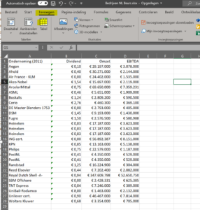 Voor de voorbeelden in dit artikel is gebruik gemaakt van gegevens uit 2011 over een aantal aan de AEX genoteerde bedrijven. Dit Excelmodel kun je met de volgende link downloaden.