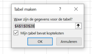 Er verschijnt een klein popup-scherm. Als het bereik al kopteksten heeft, vink het vakje daarvoor dan aan. Kies [OK] en het bereik verandert in een tabelobject.